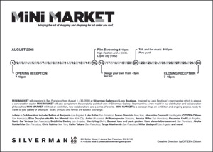 For the month of August 2008 MINI MARKET a boutique and exhibition, premiered in San Francisco at the Silverman Gallery. Art and creative direction were executed by ourselves including store interior concept, design and layout, graphic design and art direction. We also developed the logotype and created “shopping for art and the art of shopping are brought under one roof”. Also fifteen items from the CITIZEN:Citizen collection were curated for the pop up store.