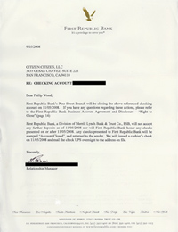 The First Republic bank yesterday issued notice to close CITIZEN:Citizen bank accounts, A letter simply informing of the closure of current checking acconts was later discovered to have been activated by Meryll Lynch legal department stating that the type of products CITIZEN:Citizen produces are unsuitable for the bank to be seen doing business with.