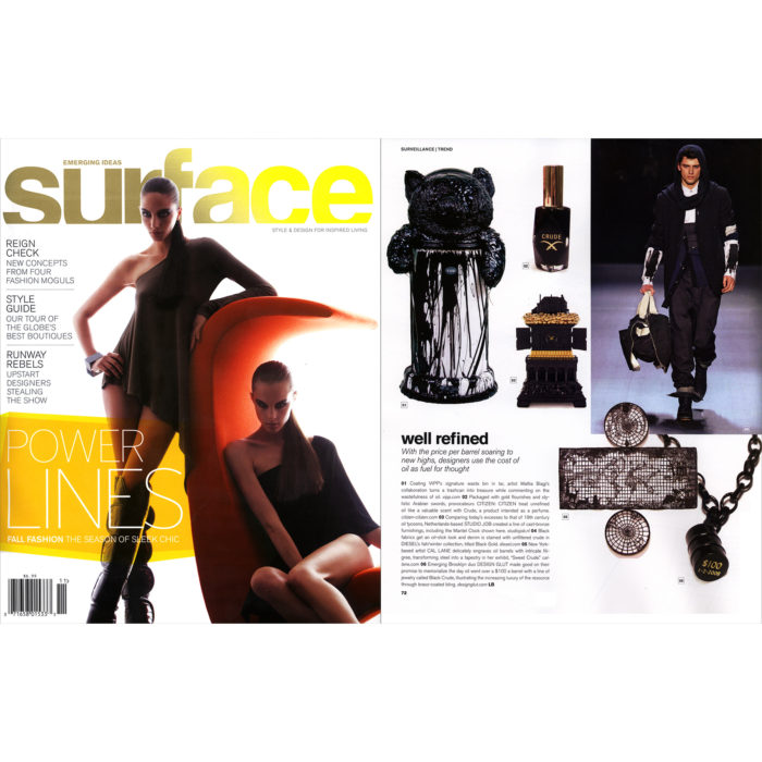 Crude Cory Ingram Date of Design 2006 Size 75 mm L, 47 mm W, 120 mm H Material Glass, crude oil, card Edition 50 Crude is a limited edition parfum, 50ml of crude oil is exquisitely packaged and branded. Both art piece and luxury item, […]
